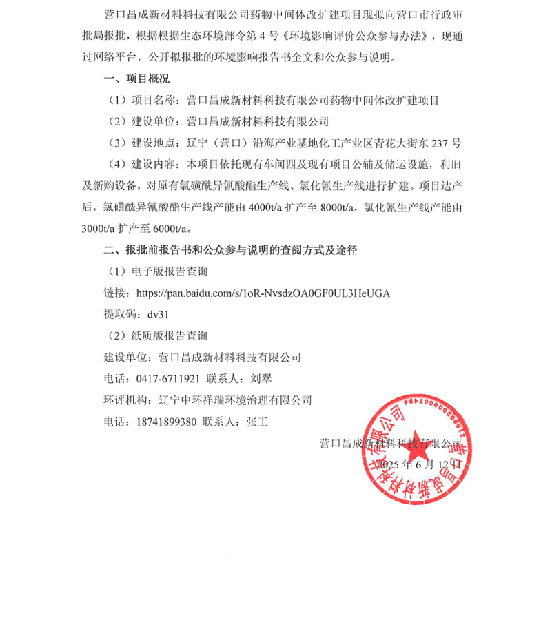 營口昌成新材料科技有限公司藥物中間體改擴建項目環(huán)境影響評價公示(報批前公示)